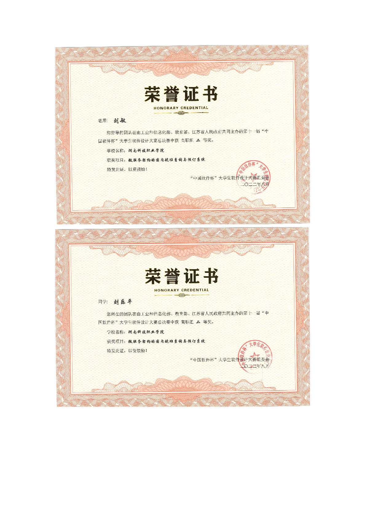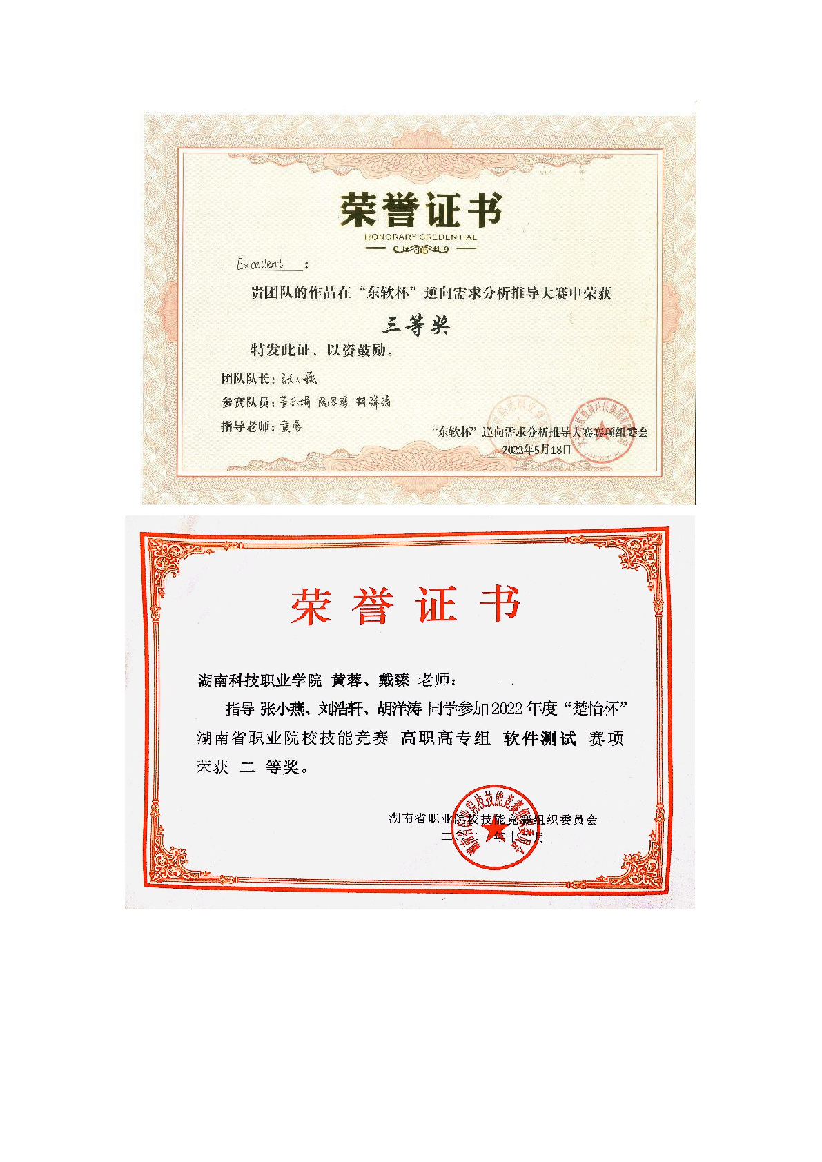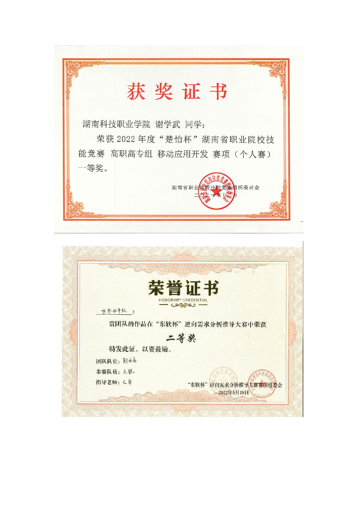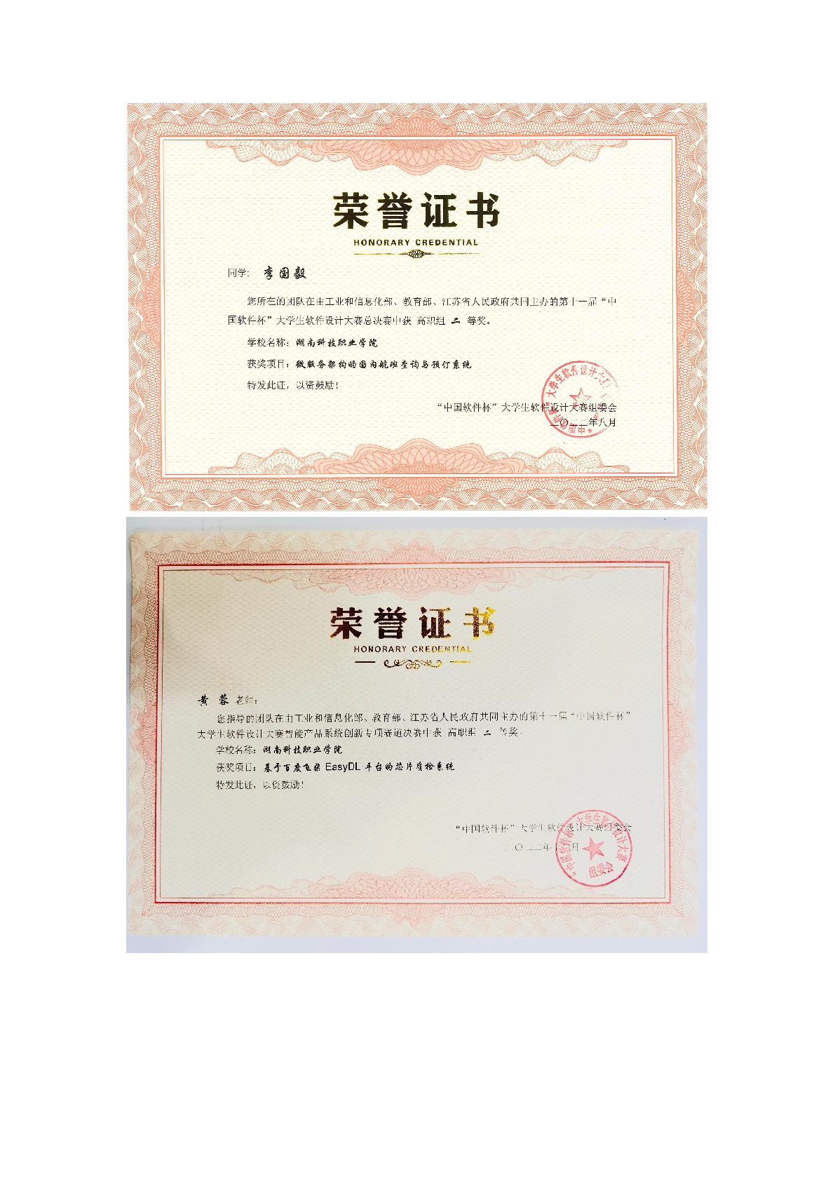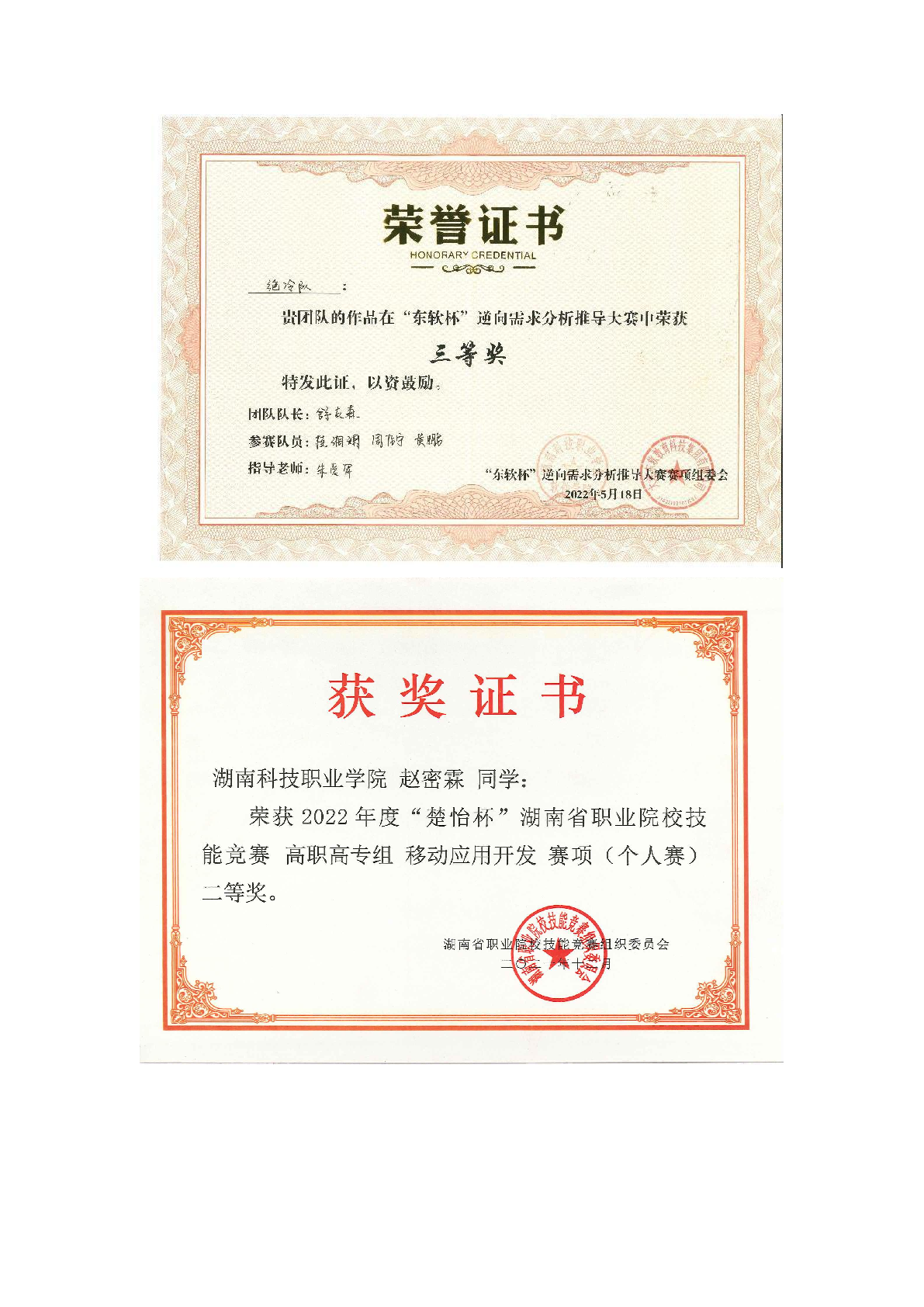 2022年度软件学院师生部分获奖证书