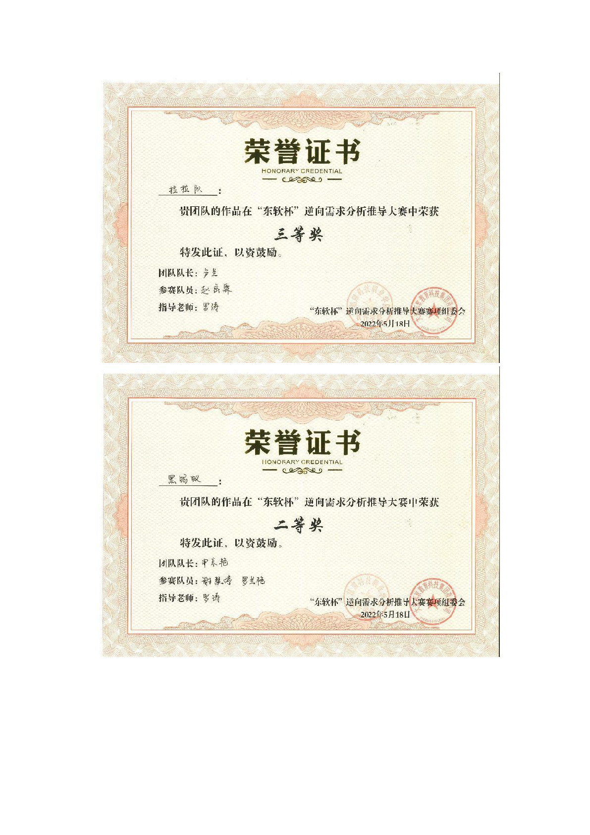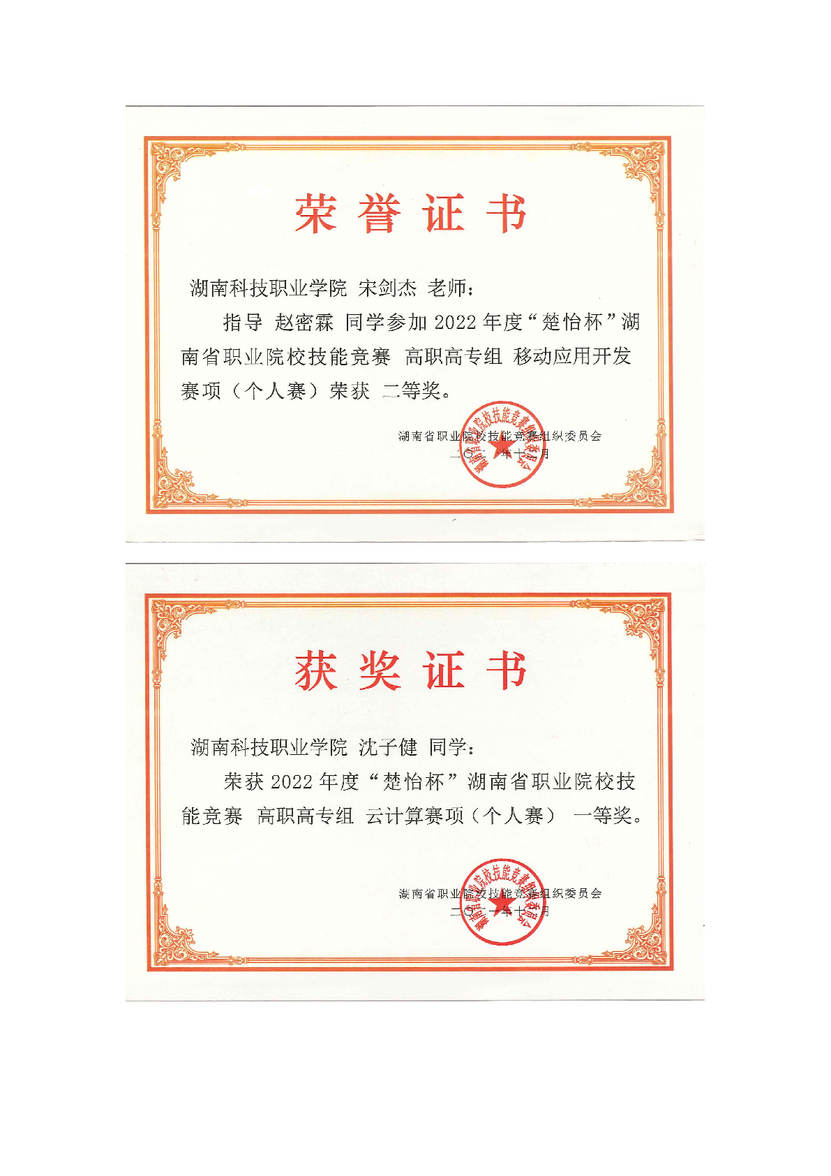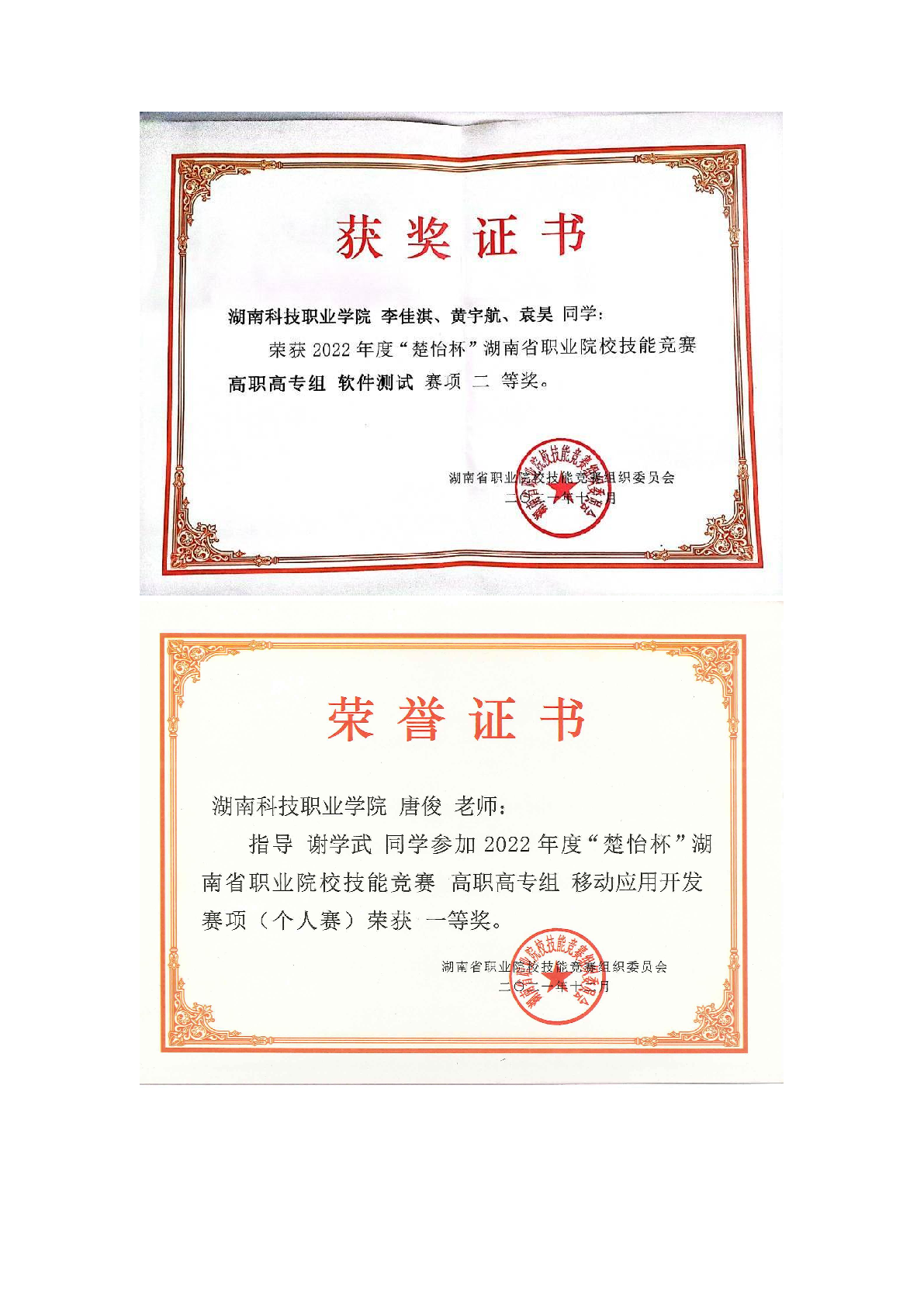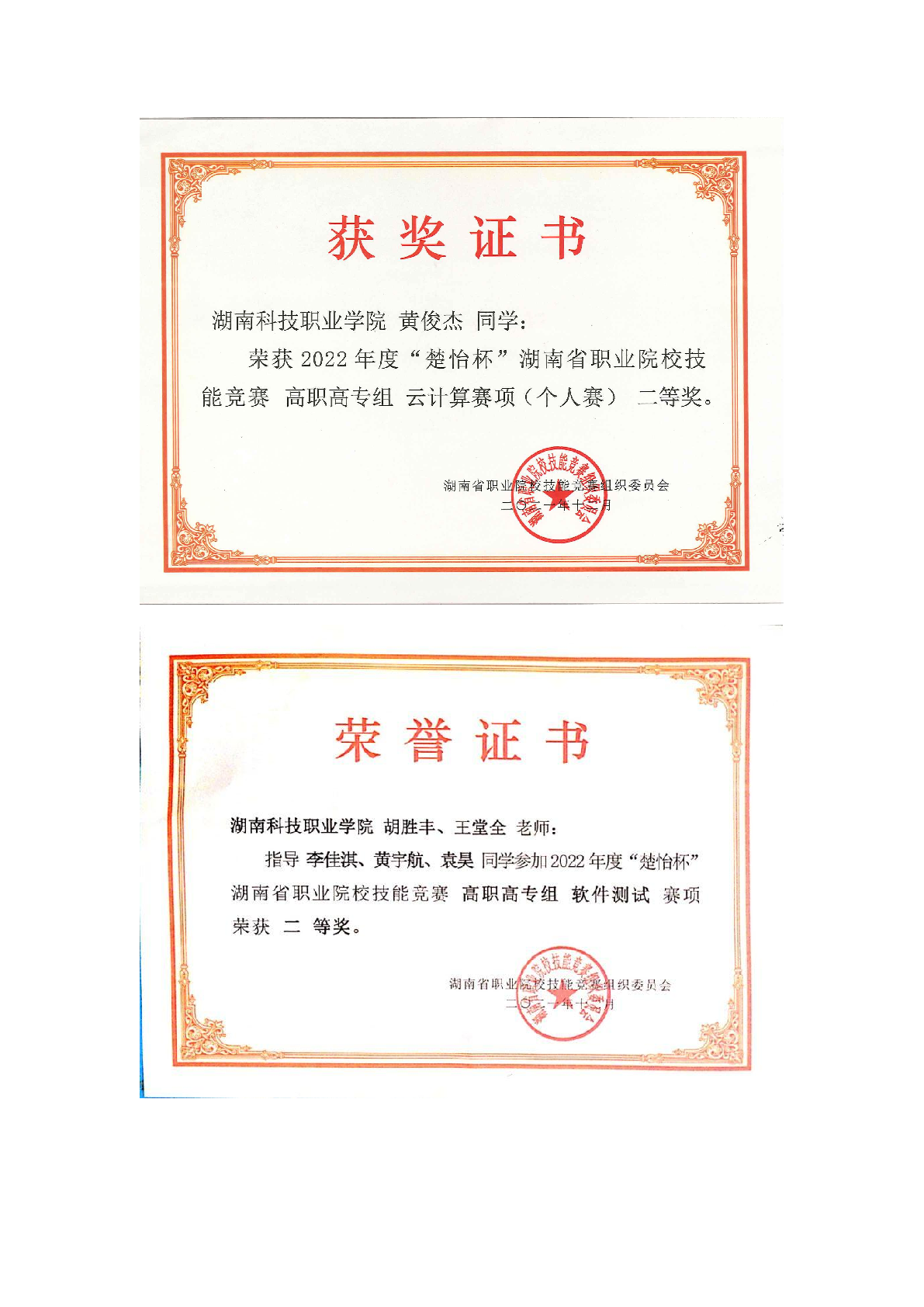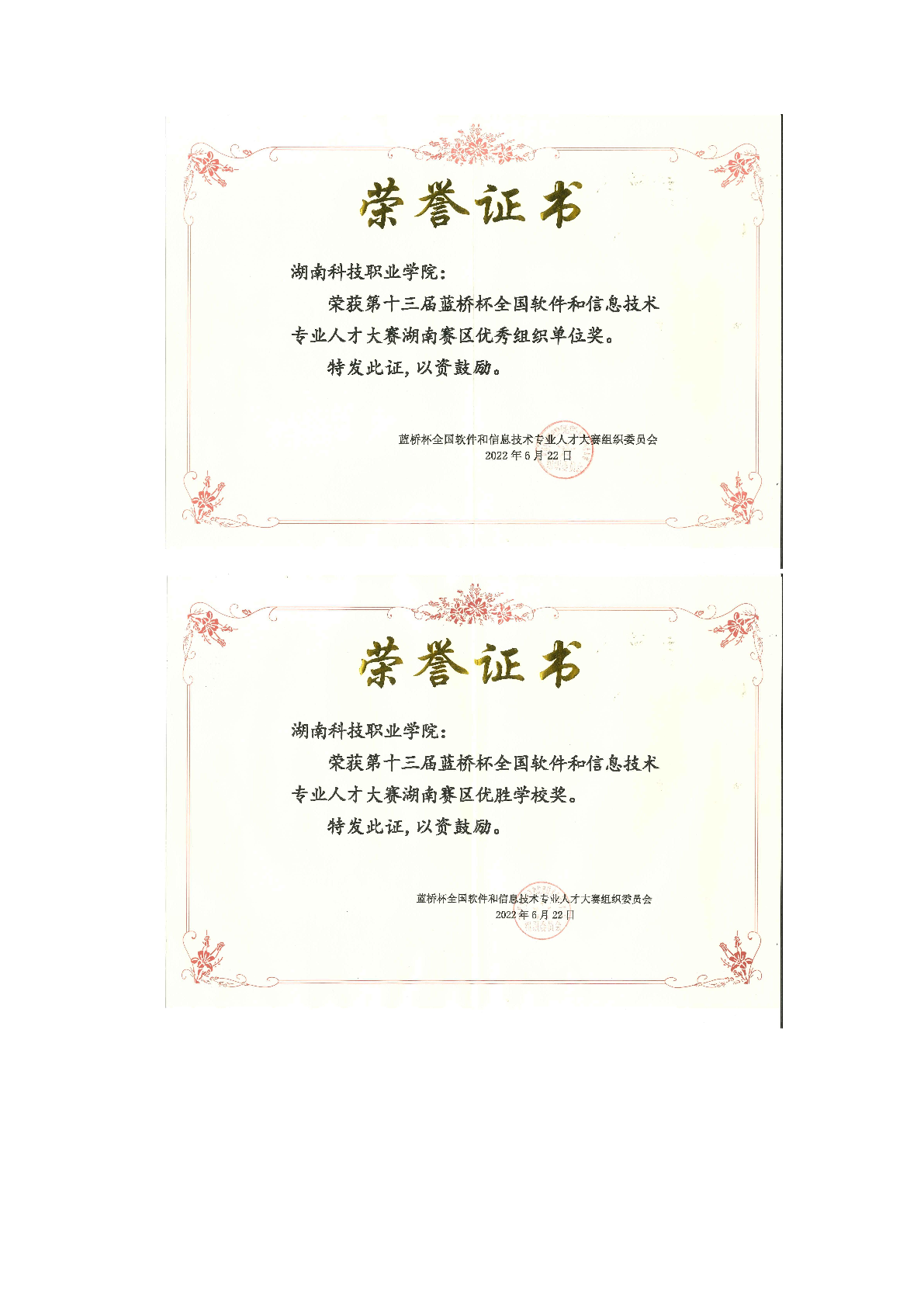 2022年度软件学院师生部分获奖证书