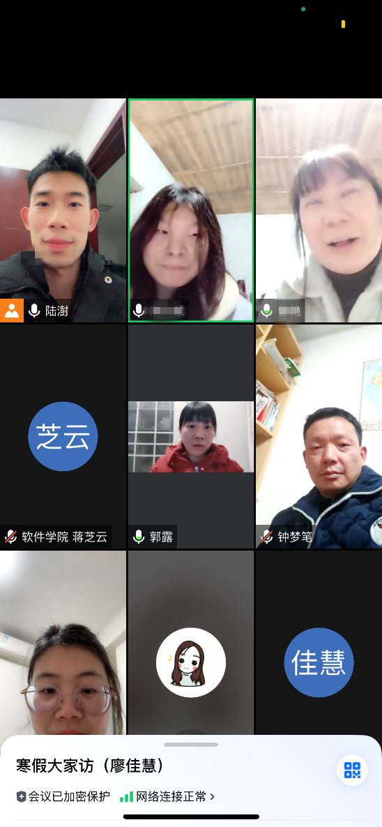 由于受冰冻恶劣天气影响,本次家访采取线上形式开展。2月28日晚,软件学院党总支书记钟梦笔、副书记郭露、团总支书记龚何雪琪、学工办主任张倩、辅导员莫佳慧、陆澍、蒋芝云等组成的家访组通过视频与2名家庭经济困难学生及学生家长进行了交流。