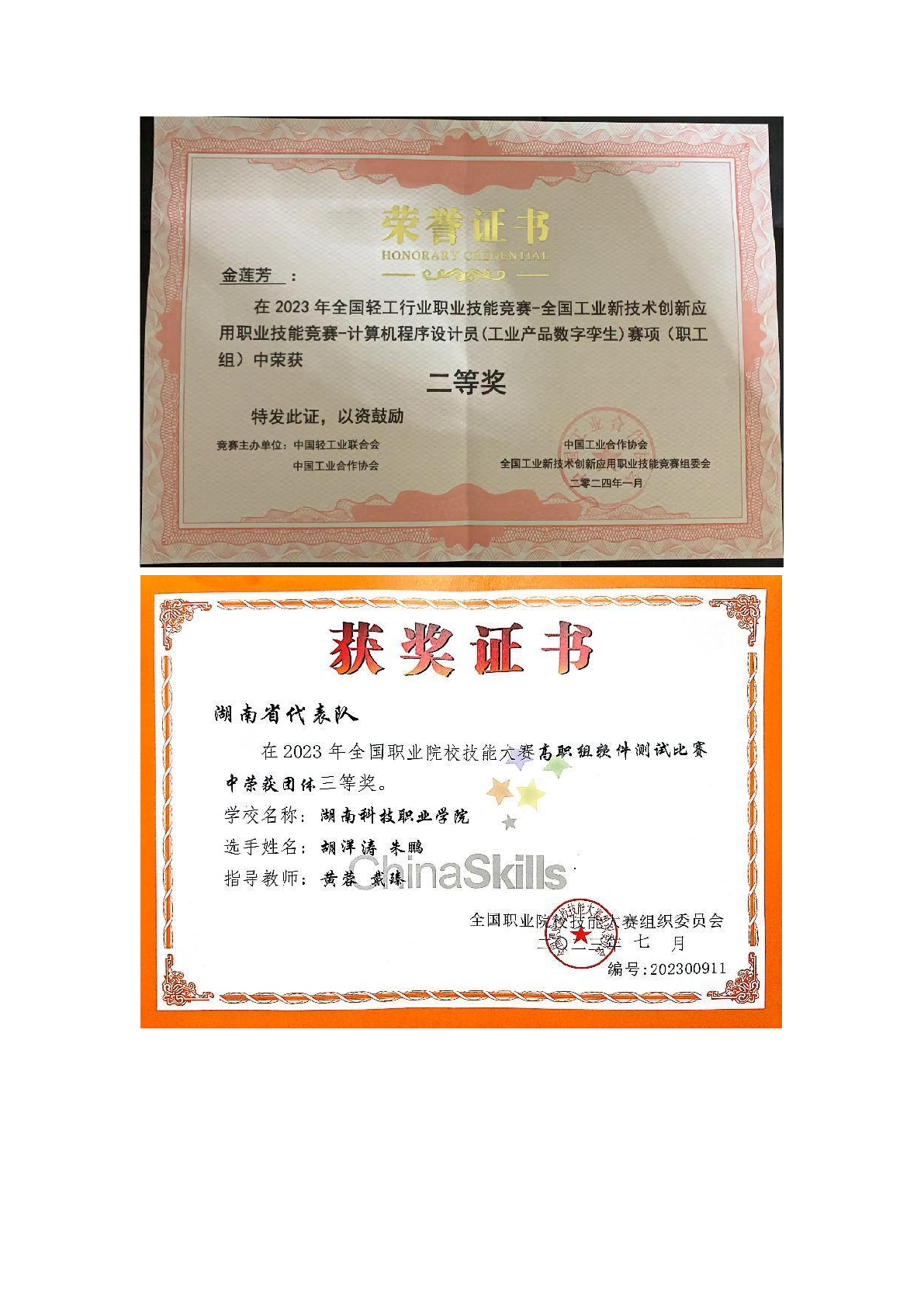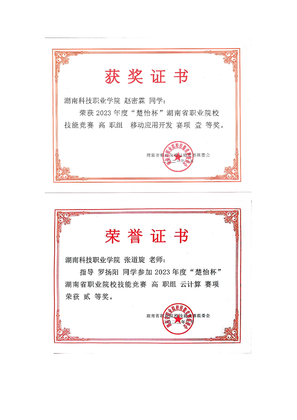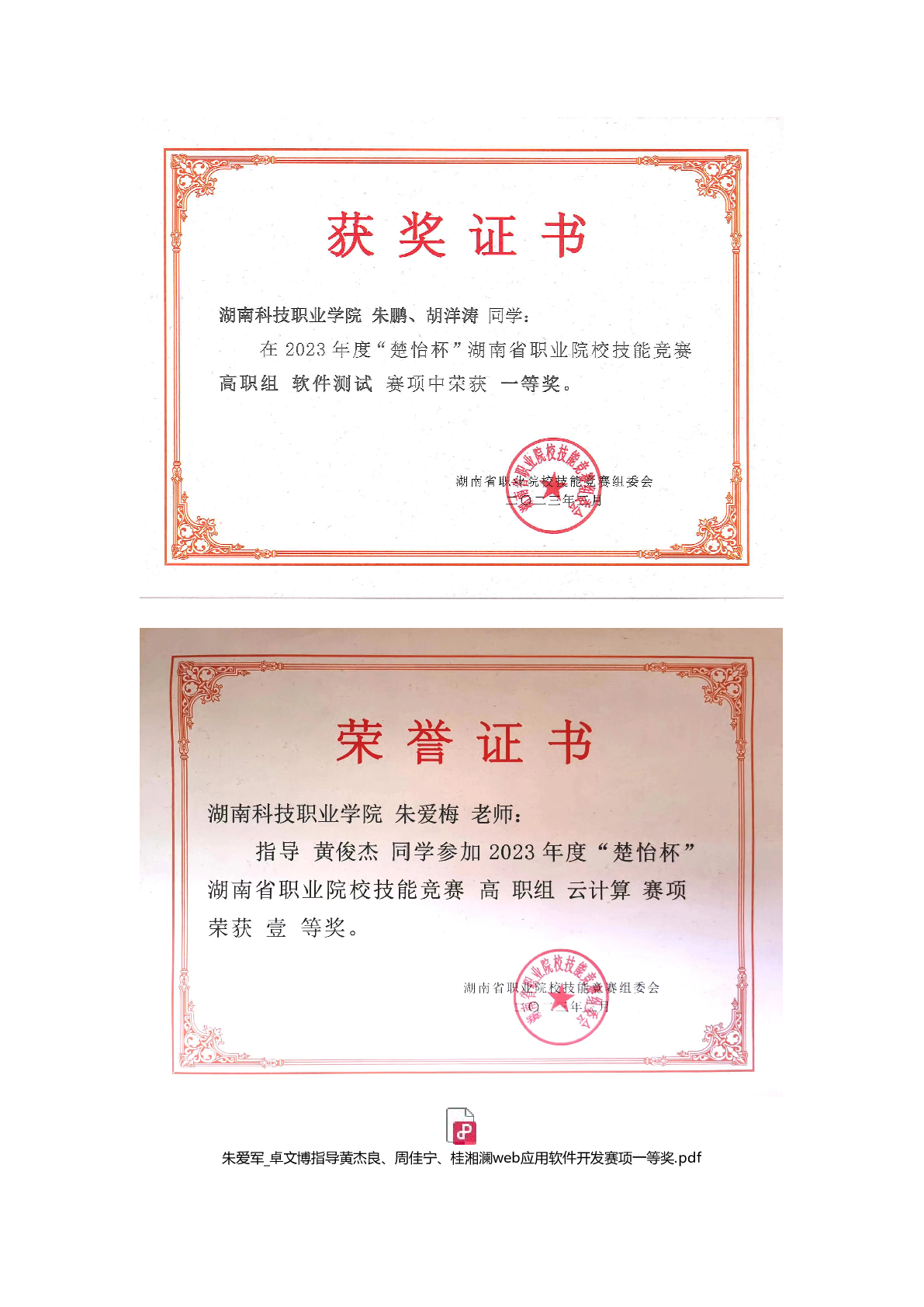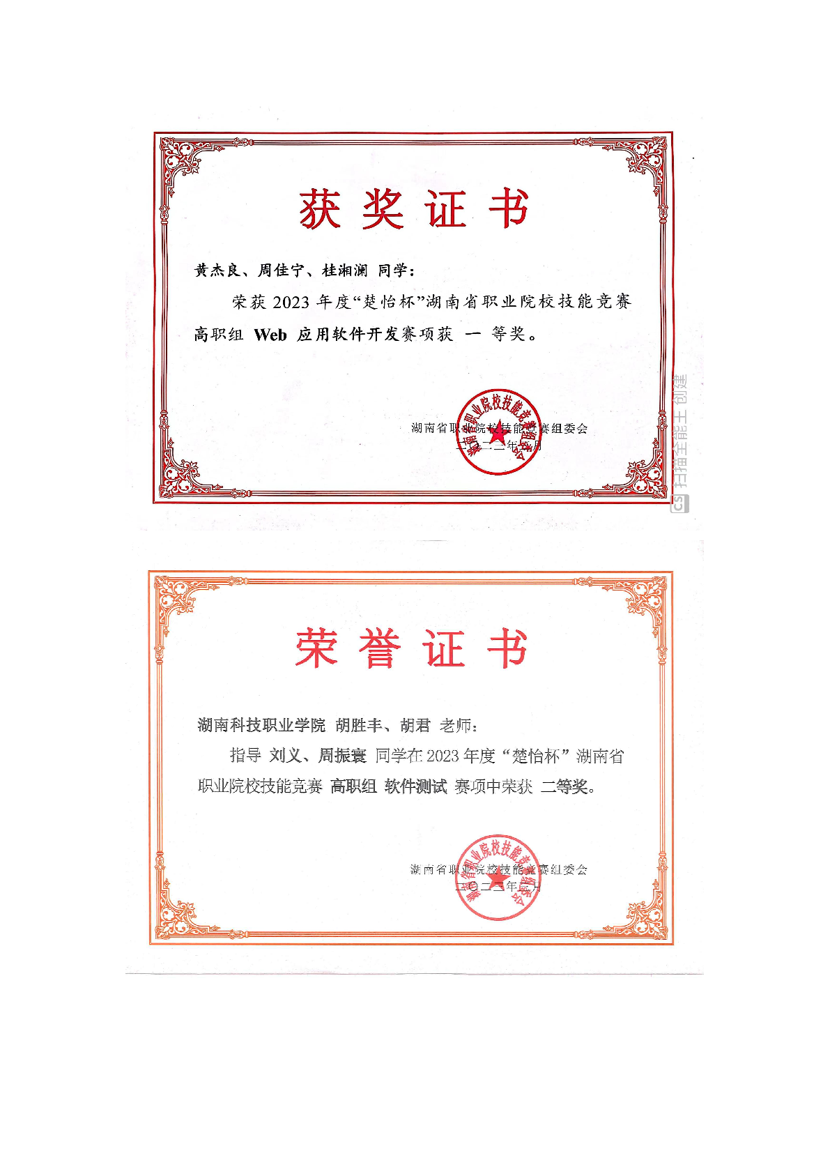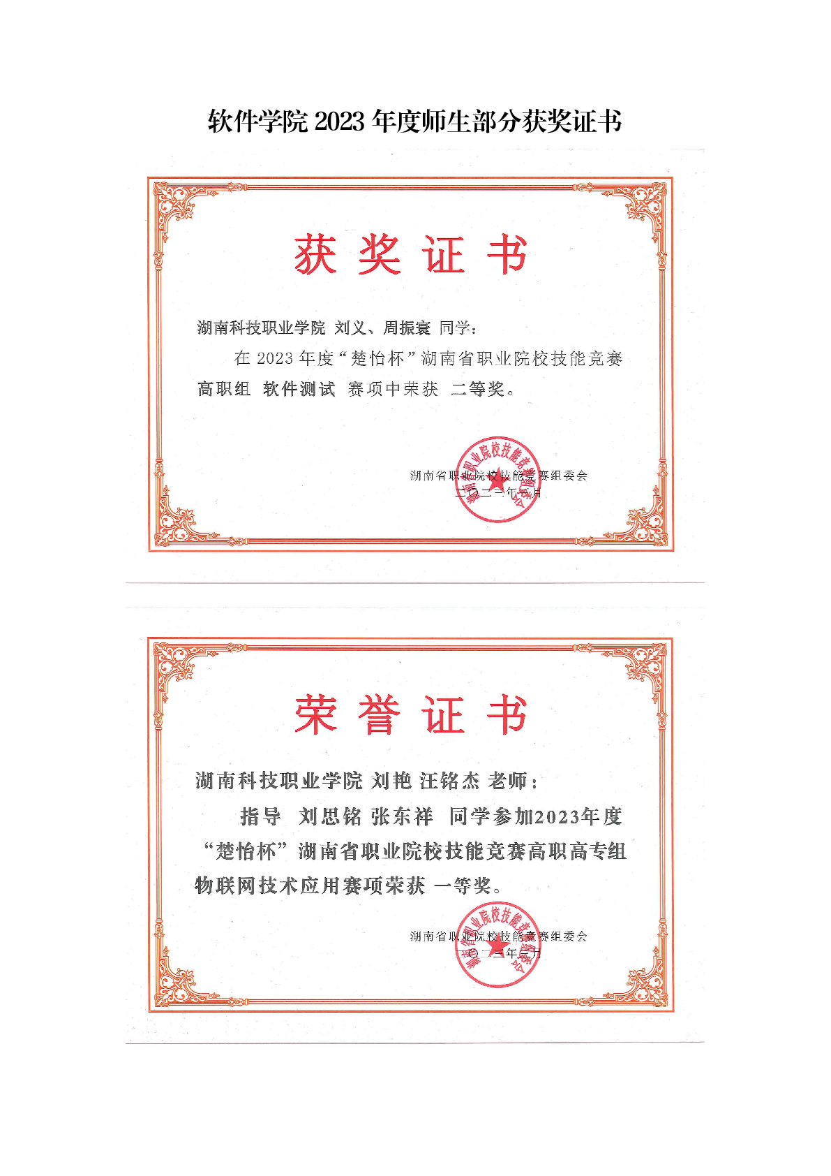 2023年度软件学院师生部分获奖证书