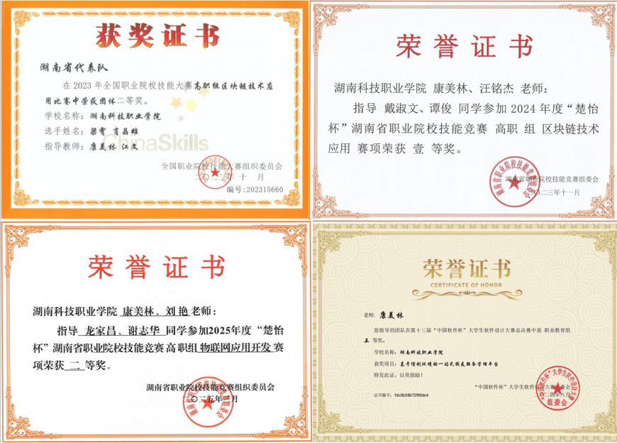 在指导学生竞赛方面,康老师展现出高度的敬业精神。为帮助学生在竞赛中取得好成绩,他牺牲个人休息时间,钻研竞赛规则和技术要点,为学生梳理知识体系。备赛过程中,他组织大量实验和模拟演练,提升学生的操作技能和应变能力。遇到技术难题时,他与学生一起查阅资料、探讨解决方案。在他的指导下,学生在各类竞赛中屡获佳绩,在全国职业院校技能大赛中,荣获二等奖 1 项;在湖南省职业院校技能竞赛中,收获 1 项一等奖与 2 项二等奖;在第十一届湖南省大学生挑战杯创新创业比赛中成功夺得银奖;在第十三届 “中国软件杯” 大学生软件设计大赛总决赛中荣获三等奖。
