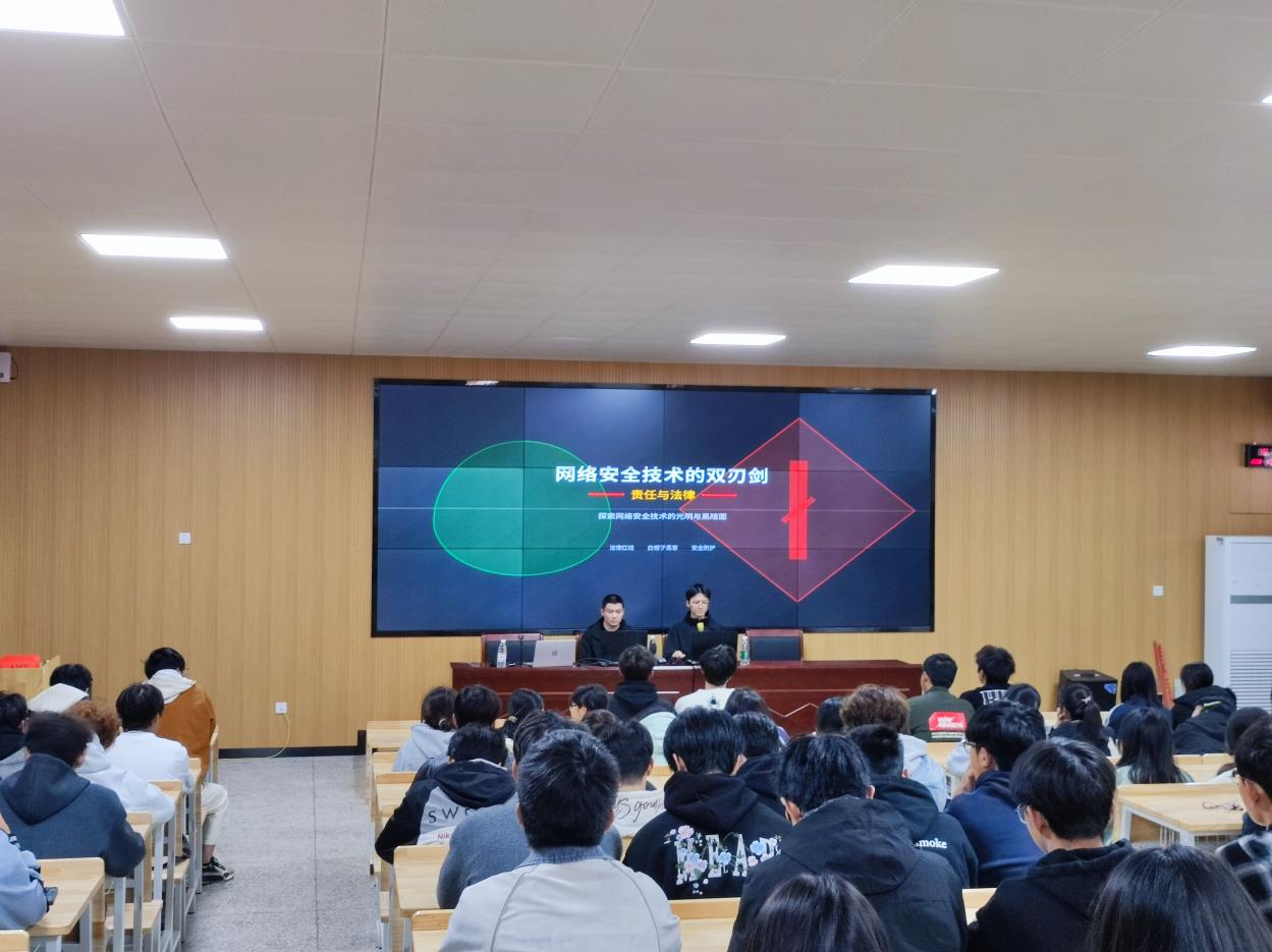 讲座伊始,长沙信安星盾科技的专家以《网络安全技术的双刃剑》为题,结合企业一线实战经验,从三大维度展开分享:解析常见漏洞类型与常用漏洞工具,夯实技术认知基础;复盘重大漏洞案例,揭示 “研究攻击是为了更好防御” 的核心逻辑;明确技术应用的法律边界与责任担当,同时介绍白帽子黑客的职责、行业需求与职业发展路径,帮助新生夯实技术认知基础,铸牢 “安全守门员” 的职业信念。