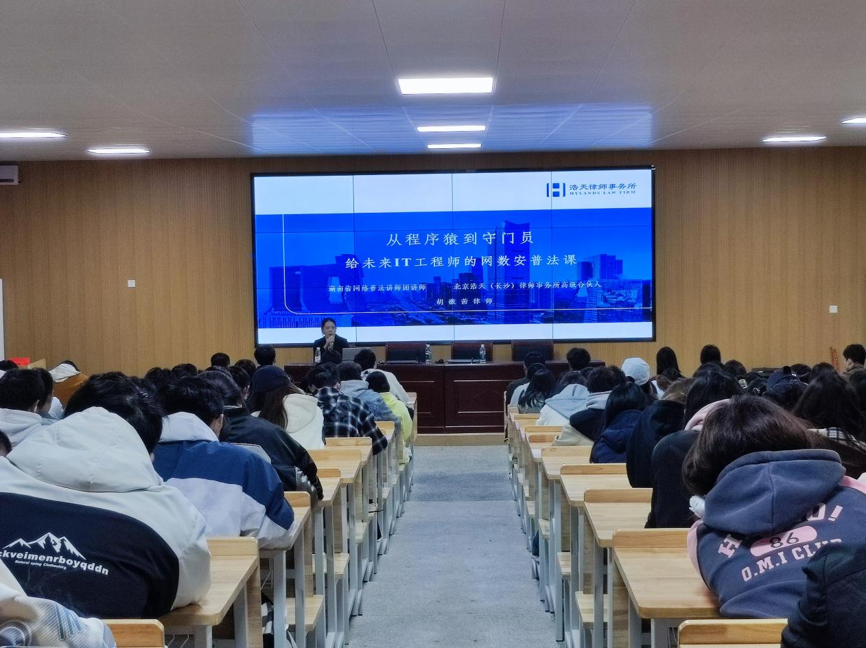 随后,北京浩天(长沙)律师事务所胡薇茜律师,以《从程序猿到守门员——给未来IT工程师的网数安普法课》为主题,用通俗视角解读专业法律知识:从网络、数据、个人信息三大领域,拆解网数安立法的底层逻辑;结合生活案例区分 “合法运用” 与 “违法滥用” 的边界,强调 “技术中立”“无主观恶意”“不懂法” 均非免责理由;清晰阐释民事责任、行政责任、刑事责任的定义与区别,让新生直观理解法律红线,引导学生在日常网络生活中学会用法律武器保护自己,同时避免成为网络违法违规行为的参与者。