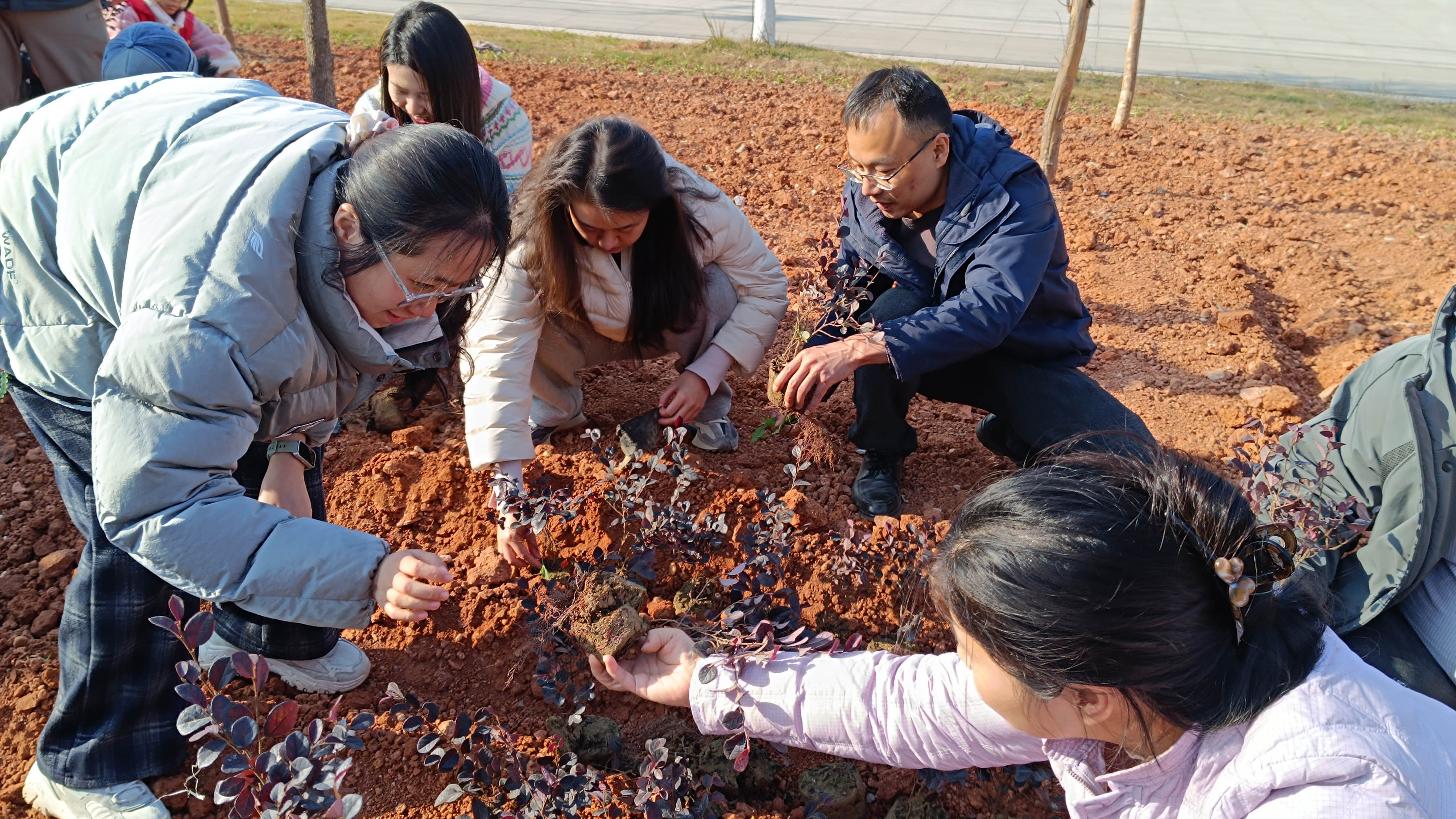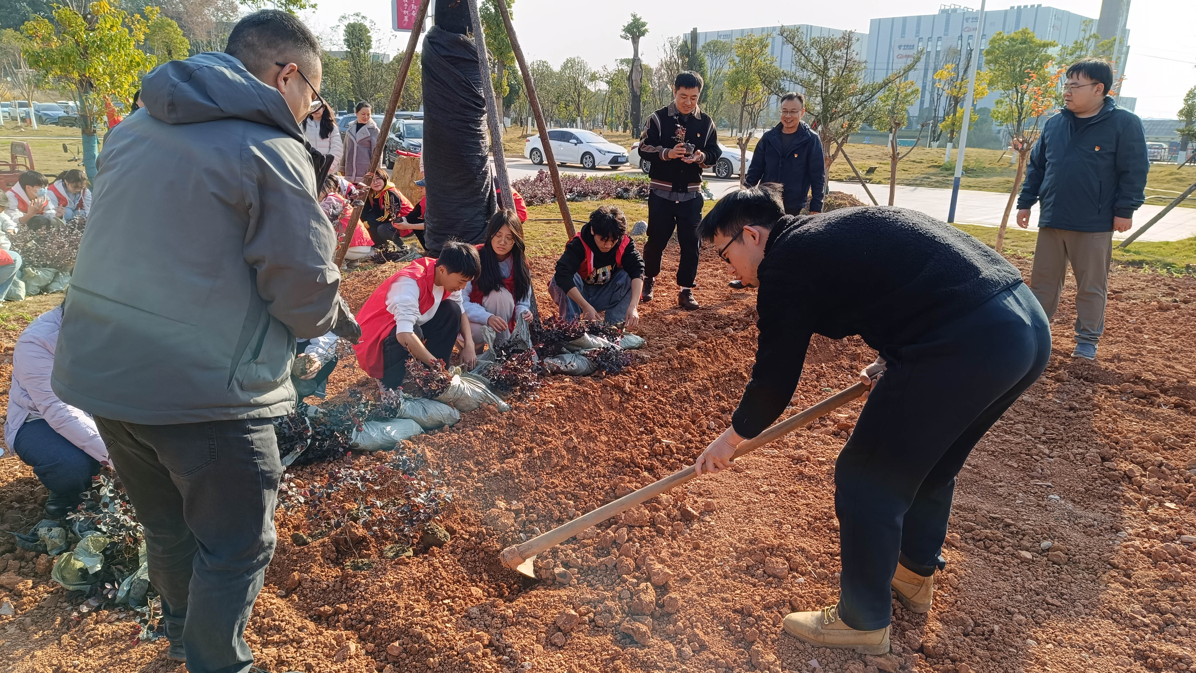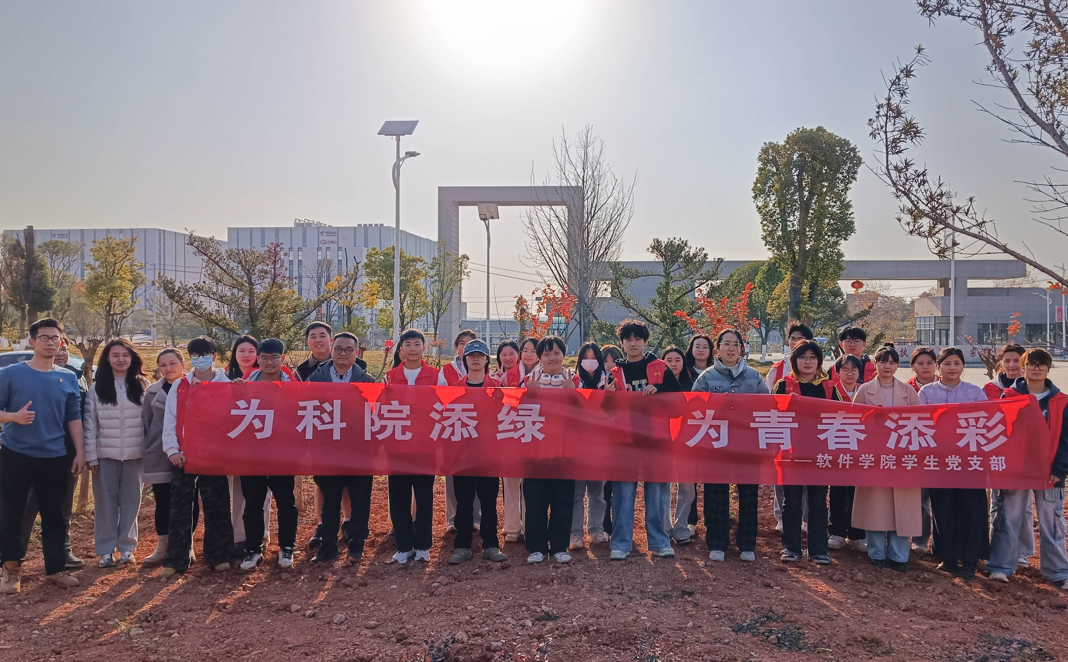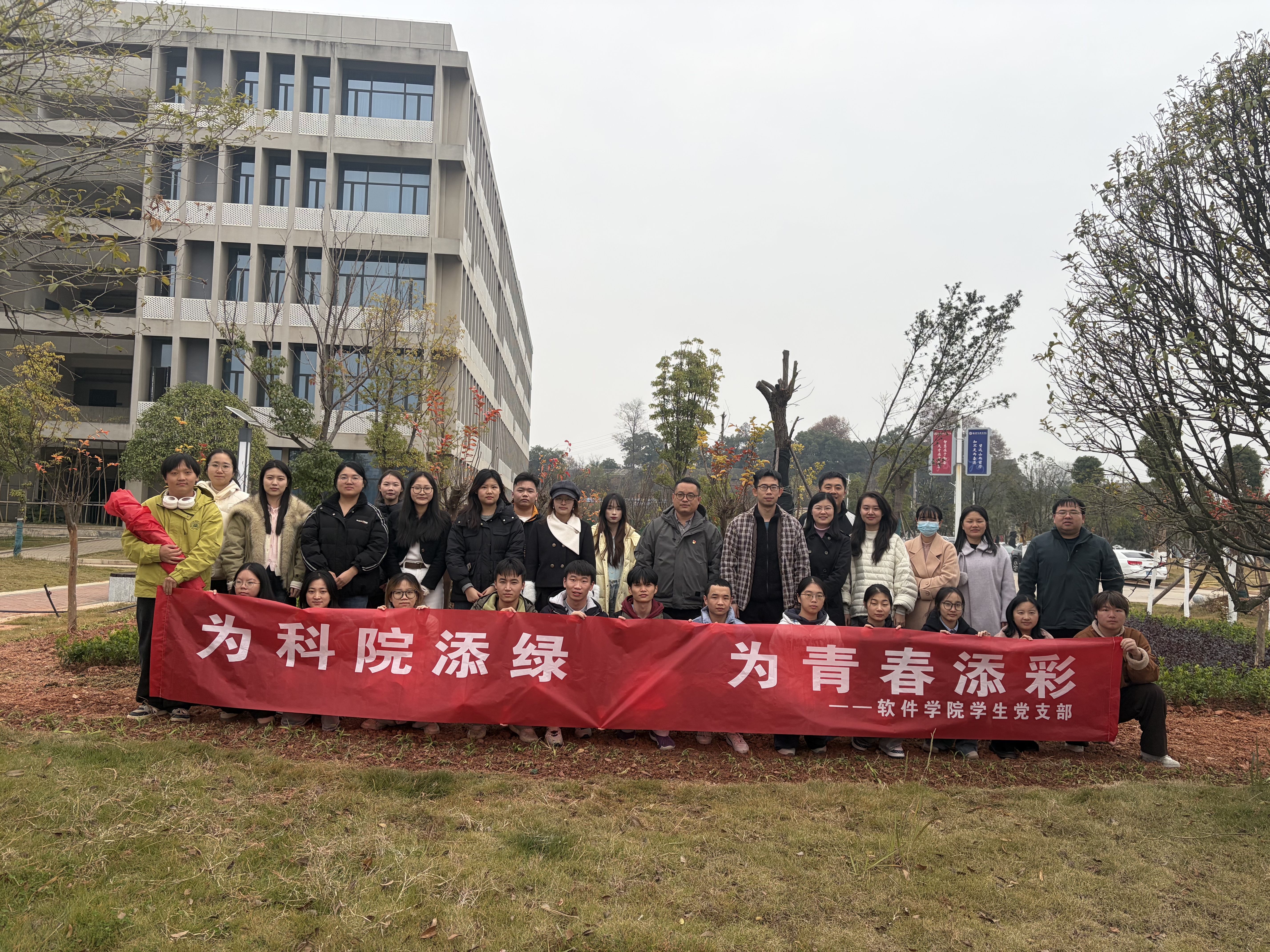 冬日和煦,绿意相迎。12月3日下午2:30,一场以“为科院添绿,为青春添彩”为主题的植树栽花活动在软件学院大楼前坪展开。本次活动由软件学院学生党支部组织,软件学院党总支书记辛绪坤、副书记兼学生支部书记向建军带领支部全体党员及入党积极分子们踊跃参与,用实际行动践行劳动育人理念,为校园初冬增添了一抹生机盎然的青春亮色。