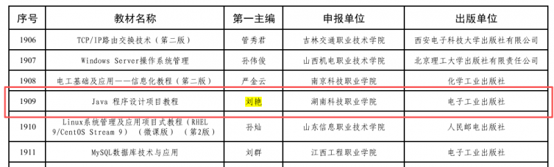 近日,教育部正式发布《关于公布第二批“十四五”职业教育国家规划教材书目的公告》,我院组织申报的《Java程序设计项目教程》教材成功入选。