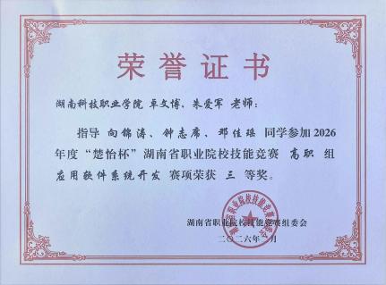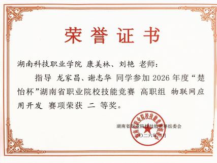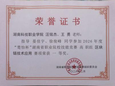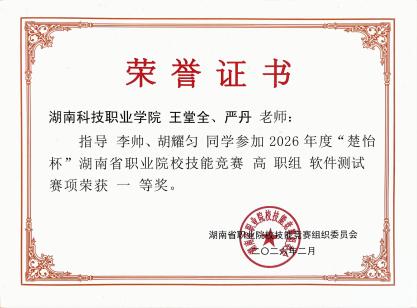 近日,2026年度“楚怡杯”湖南省职业院校技能竞赛各赛项陆续举行。我院积极组织师生参与角逐,在软件测试、区块链技术应用、智能电子产品设计与开发、物联网应用开发、应用软件系统开发等五个赛项中奋勇拼搏,最终斩获一等奖4项、二等奖3项、三等奖2项,共计9个奖项的优异成绩,展现了学院在技能人才培养方面的扎实功底与育人实效。。![]()