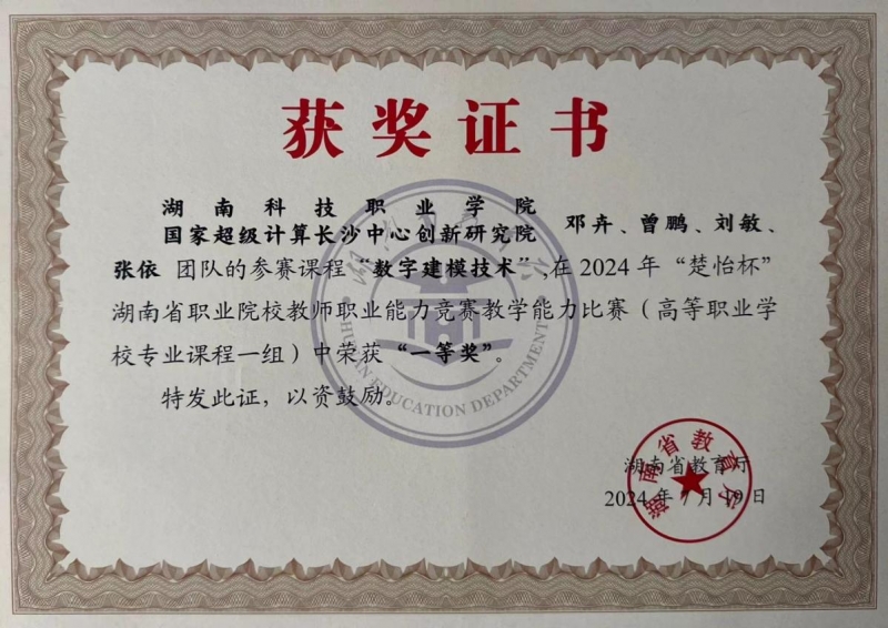 1.2024年湖南省职业院校教师职业能力竞赛教学能力比赛一等奖(获奖作品:《数字建模技术》)