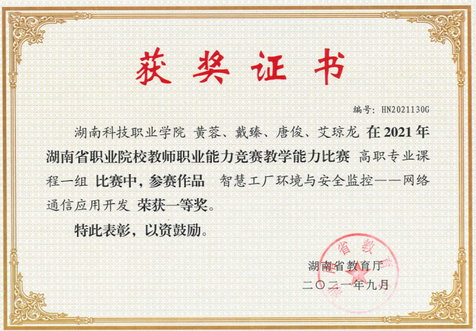 3.2021年湖南省职业院校教师职业能力竞赛教学能力比赛一等奖(获奖作品:《智慧工厂环境与安全监控——网络通信应用开发》)
