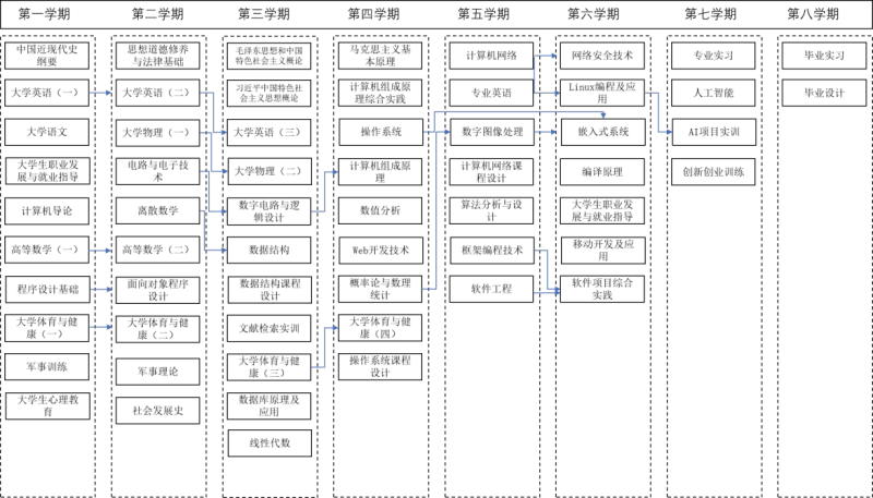 程序设计基础、离散数学、面向对象程序设计、电路与电子技术、数字电路与逻辑设计、数据结构、计算机网络、计算机组成原理、操作系统、数据库原理及应用、嵌入式系统、软件工程、算法分析与设计等。